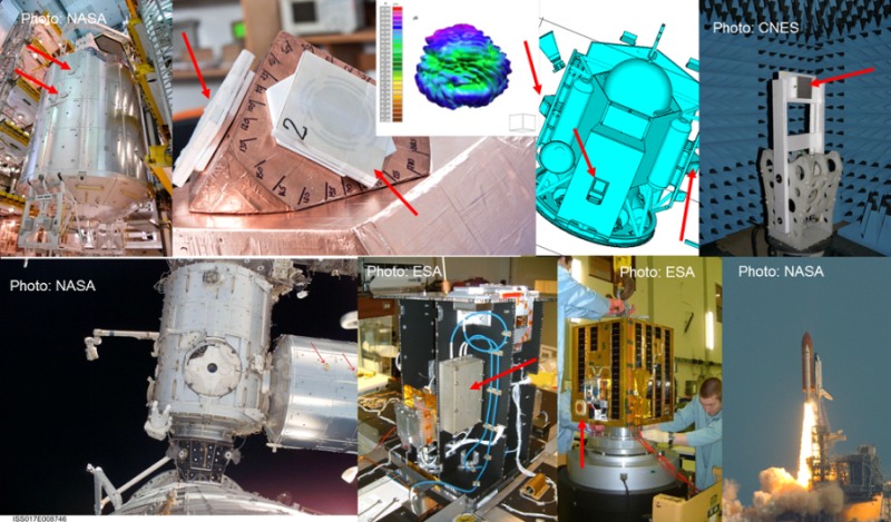 Examples of ground breaking accomplishments in the field of antennas and communication subsystems developed for aerospace applications in our team (from the top left clockwise): (1) low-profile (30mm thick) dual band RHCP antennas for Columbus module - the module is the main ESA contribution to the International Space Station; (2) RHCP/LHCP six-antenna system for the ESA Moon Probe ESMO and (3) guidelines into antenna optimum placing to ensure at least 95% no-null radiation pattern of the ESMO probe in the S-band; (4) less than 10 mm thick, lightweight X-band RHCP/LHCP 20.5 dBi antenna array for new generation of broadband spacecraft and their terminals, CNES project; (5) US Space Shuttle Atlantis lifting-off NASA KSC, with the Columbus laboratory and our antennas mounted on it, 8 Feb. 2008; (6) ESA educational spacecraft SSETI-Express with three our low-profile antennas mounted on it and (7) SSETI-Express transceiver with our housing and our microwave circuits/cabling during integration and tests at ESA/ESTEC; (8) Image taken during EVA at ISS, with clearly seen a pair of our low-profile antennas mounted on the Columbus MDP panels (June 2009).