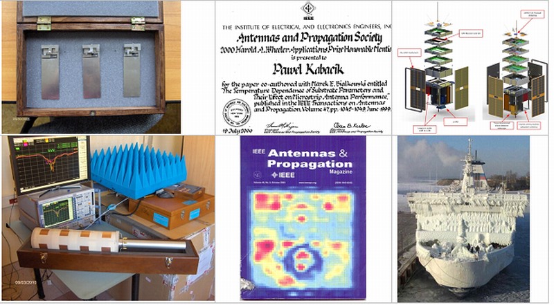 From the top left clockwise: (1) three antennas invented in our team for mobile phones (according to Motorola, Nokia and LG mobile phone antenna experts, these antennas featured the smallest volume and the broadest 900/1800 MHz bandwidths among known designs in 2002-2005 period; (2) Harold A. Wheeler Honorable Mention diploma 2000 offered to Mr. Pawel Kabacik; (3) ESA ESEO minisatellite for which we have developed S-band communication subsystem and the antenna; (4) example of icing problems on antennas with which our team has dealt under Norwegian Arctic projects; (5) the cover of IEEE Antennas and Propagation Magazine issue (Oct. 2003) showing results of antenna diagnosis with our methods implemented on the near-field antenna system developed in-house; (6) the cylindrical antenna (S-band) made with a composite panel for a new concept of radio broadband system on sea; the antennas was developed under Norwegian MarCom project and tested by A-Star in Singapore waters and laboratory for two years (2010-2012).