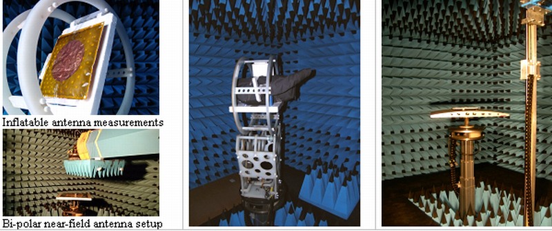 Fig. 3. Our antenna measurement facilities entirely developed in-house, including software for automatic measurements and data visualization (from top right): top radiation pattern measurements of inflatable search and rescue maritime antenna invented in our team (2010); bottom the bi-polar near-field antennas system (1994-); one of three our antenna measurement systems for radiation pattern measurements in the full spherical angle (2002-); our cylindrical antenna measurement system, the antenna under test is mounted on a part of the cylindrical ground plane such as a hull of the Columbus or a fuselage of airplane.